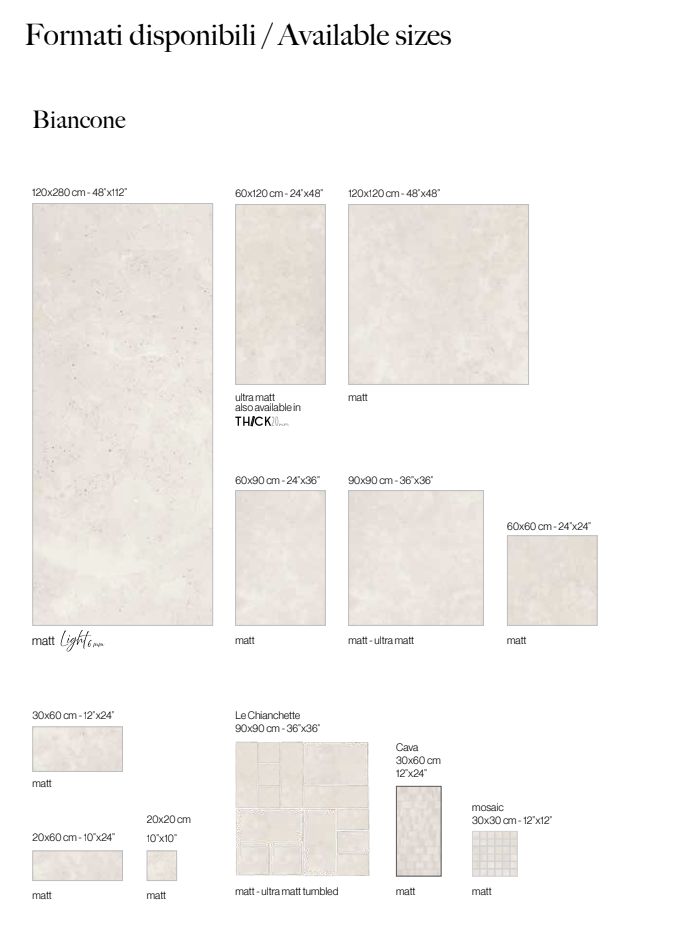 Biancone-sarja ammentaa inspiraationsa Etelä-Italian historiallisista maisemista ja tarjoaa yhden värisävyn useissa mitoissa ja paksuuksissa.